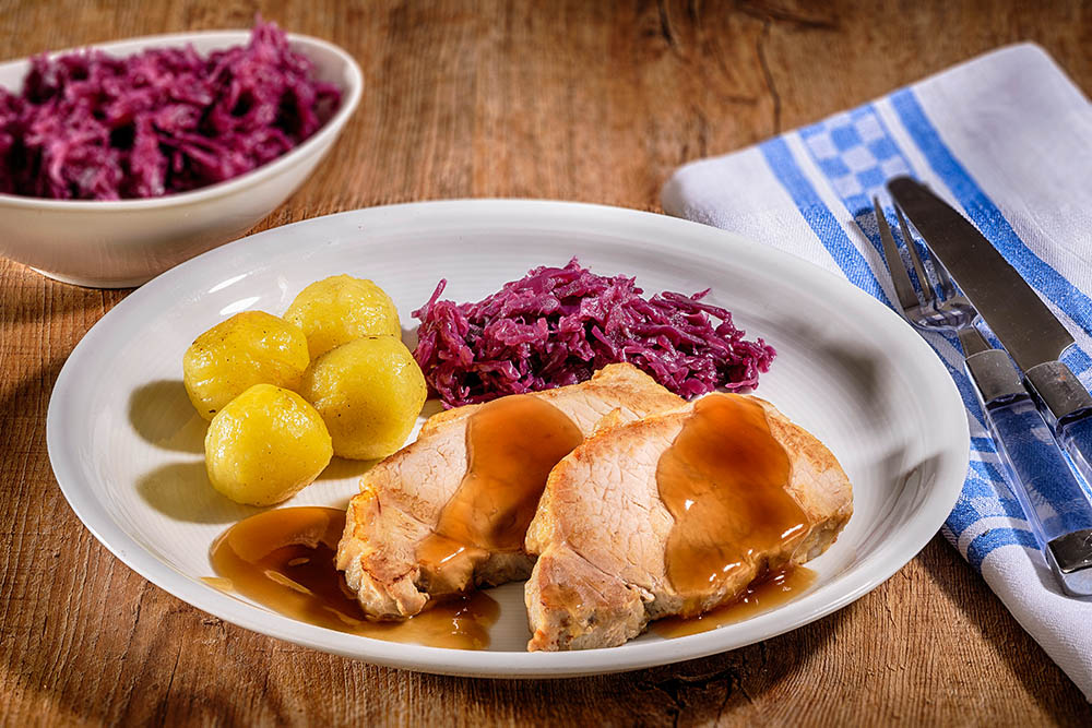Das Gericht einfach in Ruhe vorbereiten und auf Bestellung im Konvektomaten erhitzen. Westfälischer Schweinebraten an grünem Spargel, Kartoffelspalten und verfeinert mit Bratenjus und Waldpilzen.