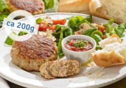 Burger made with medium-fine mince, onion pieces, herbs and spices scattered visibly throughout, roasted, I.Q.F., in pillow bags; unit weight: approx. 200 g